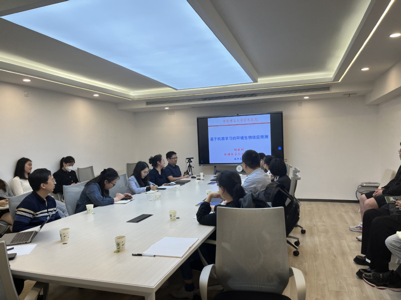 胡献刚概述了机器学习和人工智能技术在环境研究领域的发展历程,介绍了团队利用机器学习技术在环境生物纳米界面方向取得的一系列成果,以及将全球尺度环境大数据与人工智能技术结合的最新研究进展。会后,胡献刚与在场师生就纳米材料的生态毒理效应、环境大数据、机器学习方法等问题进行了充分的互动交流。