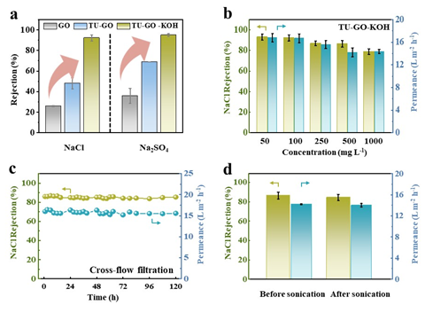 (b) TU-GO-KOH 膜在不同NaCl 浓度下(50 - 1000 mg L-1)的纳滤性能