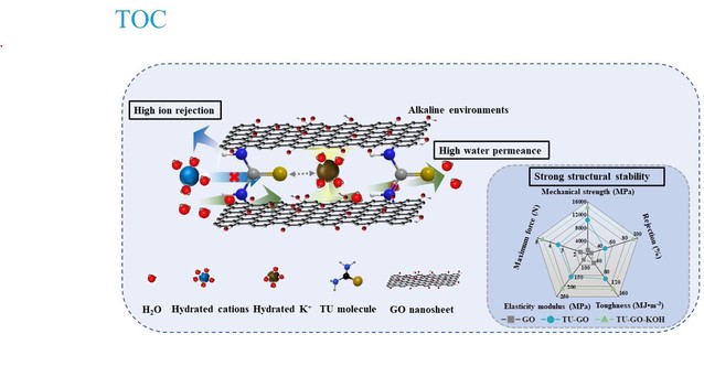 图 1. KOH 溶液处理的TU 交联氧化石墨烯膜通道构建及性能示意图